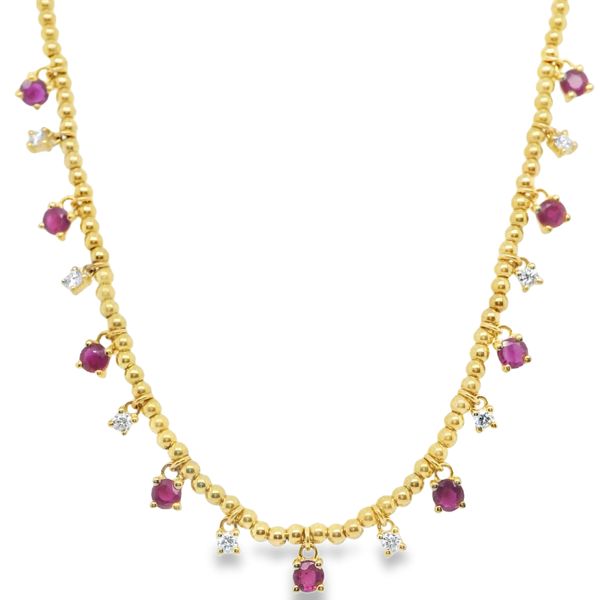 (786) 470-4423Yellow Gold Beaded Necklace with Cabochon Ruby Accents